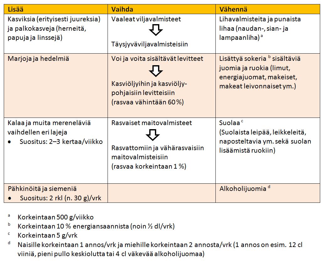 Taulukko 1. Keskeisimmät suositeltavat ruokavaliomuutokset. Klikkaa taulukko isommaksi.