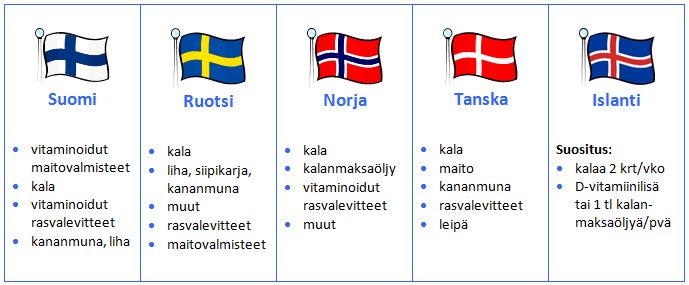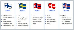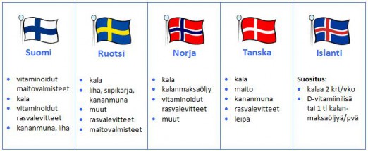 D-vitamiinin keskeiset lähteet Pohjoismaissa. Klikkaa taulukko isommaksi