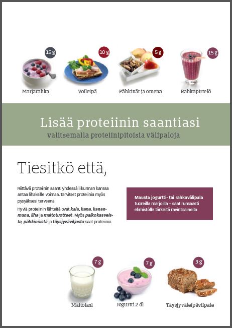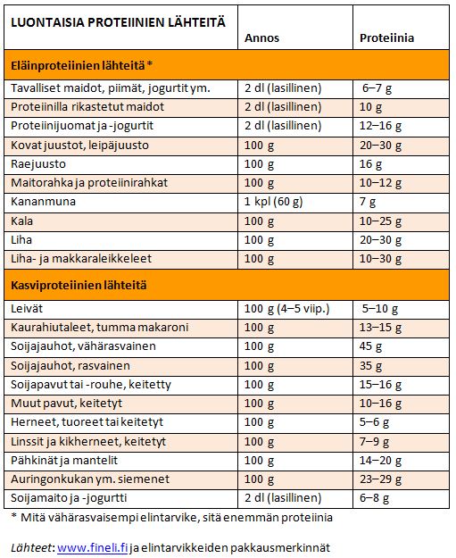 Parhaat proteiinien lähteet ovat taulukossa. Sen avulla voi arvioida ruokavalion proteiinimäärän ja suunnitella keinoja sen lisäämiseksi. Lisäapua saa Gerontologinen ravitsemus ry:n nettisivuilta (http://www.gery.fi/). Siellä on esimerkiksi elintarvikkeiden ja ruoka-annosten valokuvia proteiinimäärineen sekä muutama esimerkkiruokavalio.