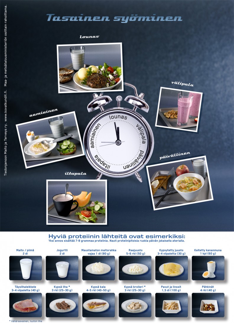 Aivot eivät pidä pitkistä ruokaväleistä. Kuva Maito ja Terveys ry: n julisteesta Tasainen syöminen.