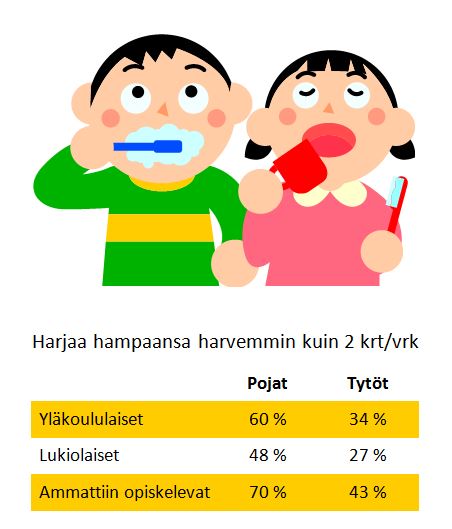 Nuorten terveystottumuksista hampaiden harjauksessa ja vapaa-ajan liikunnan harrastamisessa on tapahtunut kohennusta 2000-luvun alkuun verrattuna. Edelleen kuitenkin huolestuttavan moni, erityisesti pojista, harjaa hampaitaan harvemmin kuin kaksi kertaa päivässä.