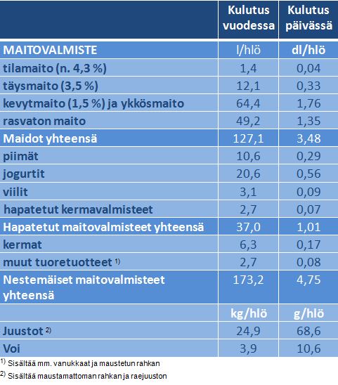 Maidon kulutus väheni edellisvuodesta noin prosentin. Rasvaprosentin mukaan jaoteltuna puolet oli kevytmaitoa, 40 prosenttia rasvatonta ja 10 prosenttia täysmaitoa edellisvuoden tavoin. Viime vuonna maitoa juotiin 127 litraa henkeä kohti.
