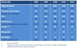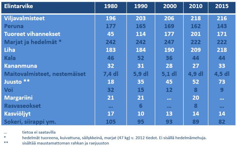 Nestemäisiä maitovalmisteita nautittiin viime vuonna 169 litraa, juustoa kului lähes 27 kiloa, viljaa ja lihaa noin 79 kiloa, 65 kiloa hedelmiä ja 61 kiloa vihanneksia.
