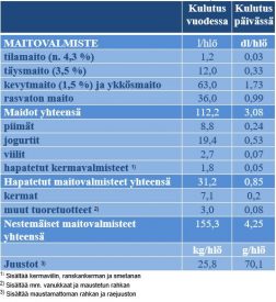 Juuston kulutus väheni hieman edellisvuodesta vajaaseen 26 kiloon. Voin kulutus oli samaa luokkaa kuin edellisenä vuonna eli 3,5 kiloa henkeä kohti.
