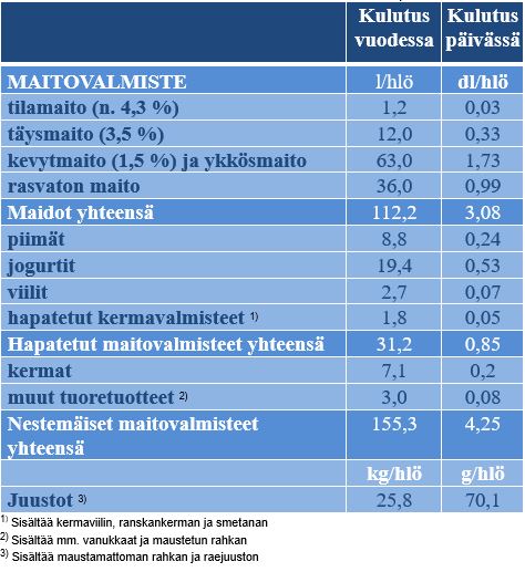 Kaikkiaan maitoa juotiin viime vuonna keskimäärin noin 112 litraa henkeä kohti, josta rasvatonta maitoa oli kolmannes, kevytmaitoa 56 prosenttia ja täysmaitoa reilu kymmenen prosenttia.