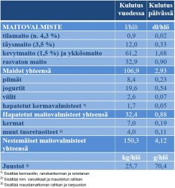 Juuston kulutus pysyi suunnilleen ennallaan noin 26 kilossa. Myös voita kulutettiin saman verran kuin edellisenä vuonna, 3,5 kiloa.