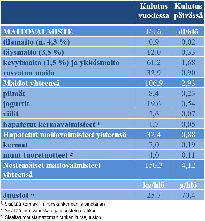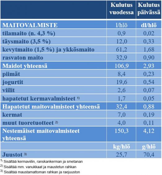 Keskimäärin maitovalmisteiden kulutus joko laski hieman tai pysyi ennallaan. Jogurttia syötiin edellisvuoden malliin. Piimän ja viilin kulutus väheni 4–5 prosenttia. Muiden maitopohjaisten tuoretuotteiden, kuten maustettujen rahkojen, kulutus kasvoi. Nestemäisiä maitotuotteita käytettiin viime vuonna yhteensä noin 150 litraa henkeä kohti eli noin kolme prosenttia vähemmän kuin edellisenä vuonna.