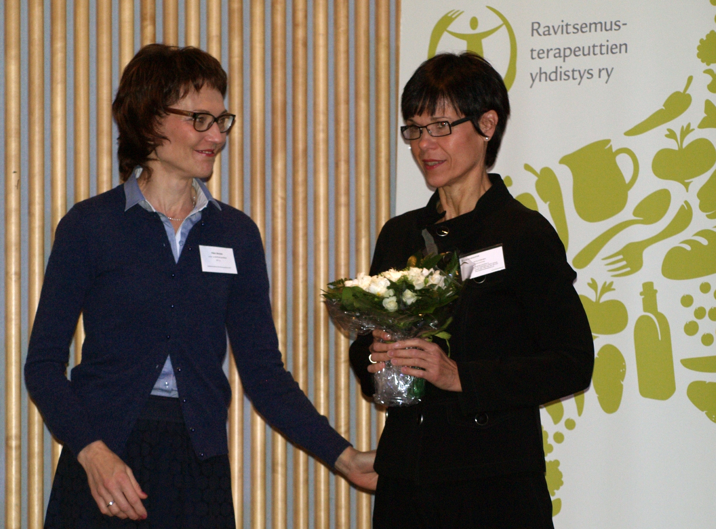 Riitta Stirkkinen kukitettiin RTY-päivien käynnistäjänä 20. Valtakunnallisilla ravitsemuspäivillä.