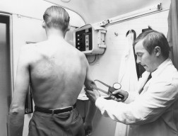 Lääkintävahtimestari Isto Savolainen mittaa ihopoimun paksuutta. Kuva kirjasta Autoklinikka.