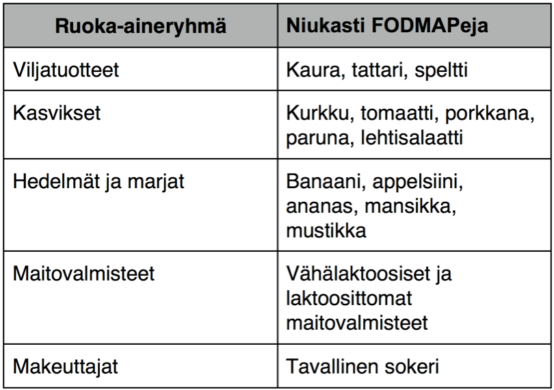 Taulukko 1. Niukasti FODMAP-hiilihydraatteja sisältäviä ruoka-aineita.