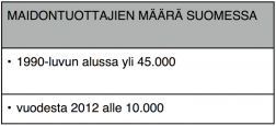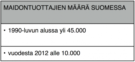 Maidontuottajien määrä on vähentynyt parin vuosikymmenen aikana viidennekseen. Siitä huolimatta tuotetun maidon määrä on pysynyt lähes samana. Maitoa on tuotettu noin 2200-2400 miljoonaa litraa vuodessa.