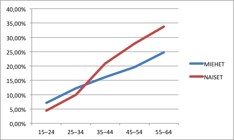 Lähde: Satu Helakorpi, Anna-Leena Holstila, Suvi Virtanen ja Antti Uutela: Suomalaisen aikuisväestön terveys ja terveyskäyttäytyminen, kevät 2011. THL:n Raportti 45/2012 sekä aiempien vuosien vastaavat raportit