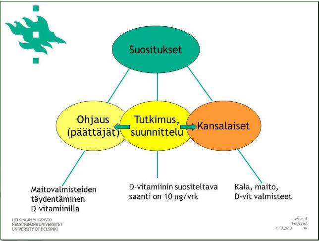 Suosituksista käytäntöön. Kuva professori Fogelholmin esityksestä Ravitsemus Suomessa -seminaarissa.