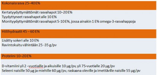 Rasvan saannin vaihteluväliä on väljennetty aiemmasta 25–30 prosentista 25–40 prosenttiin päivittäisestä energiansaannista. Suunnittelua varten käytetään lukuja 32–33 E%. Hiilihydraatteja suositellaan 45–60 % ja proteiinia 10–20 % energiasta. Ravintokuidun suositus on ennallaan, vähintään 25–35 grammaa päivässä.