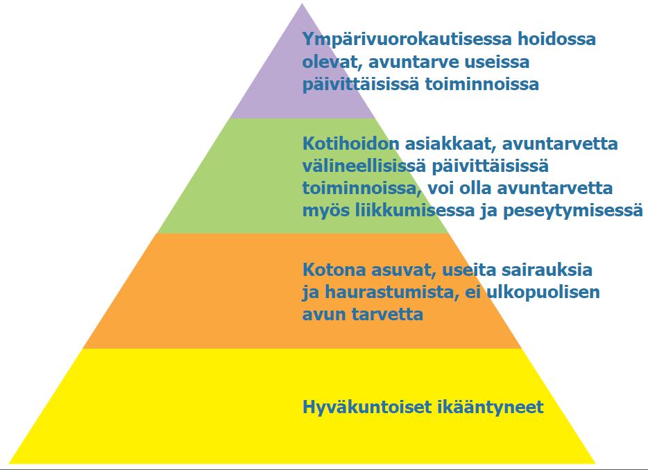 Yli 80-vuotias voi olla terve eikä käytä lääkkeitä, toisaalta 60-vuotiaalla saattaa olla useita sairauksia ja monenlaisen tuen tai avun tarvetta. Välimaastoon jää kasvava ryhmä ikääntyneitä, joiden ravitsemuksen arviointiin ja ravitsemusohjauksen tai -hoidon tarpeeseen pitää olla asiantuntemusta ja osaamista. Ravitsemussuositukset ikääntyneille -oppaassa vuodelta 2010 ikääntyneiden terveyden, sairauksien ja avuntarpeen eroja on havainnollistettu kolmiolla, josta ikä on tarkoituksella jätetty pois jaottelun perusteena.