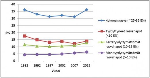 Finravinto 2012 -tutkimuksen tulokset osoittavat, että suomalaisten aikuisten ruokatottumusten pitkäaikainen myönteinen kehitys rasvan laadun paranemisessa ja suolan saannin vähenemisessä näyttää pysähtyneen. Rasvan osuus energiasta on kasvanut. Kasvu näkyy paitsi tyydyttyneen myös tyydyttymättömän rasvan osuuksien kasvamisena.